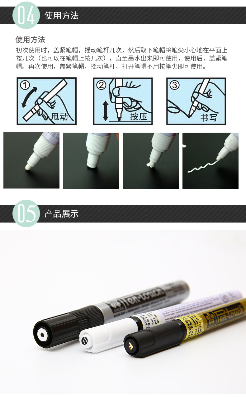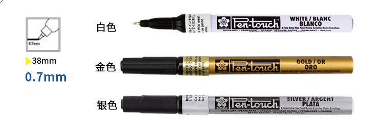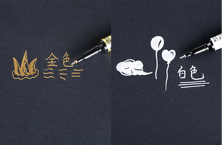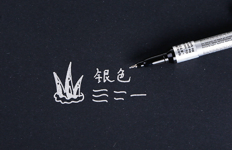 有金、銀、白三種顏色,使用時書寫流暢。初次使用時,蓋緊筆帽,搖動筆桿數次,然后取下筆帽將筆尖輕輕在平面上按幾次,直至墨水出來,才可使用,使用后蓋緊筆帽,搖動筆桿,打開筆帽不用按筆尖即可使用,用后最好平置。
