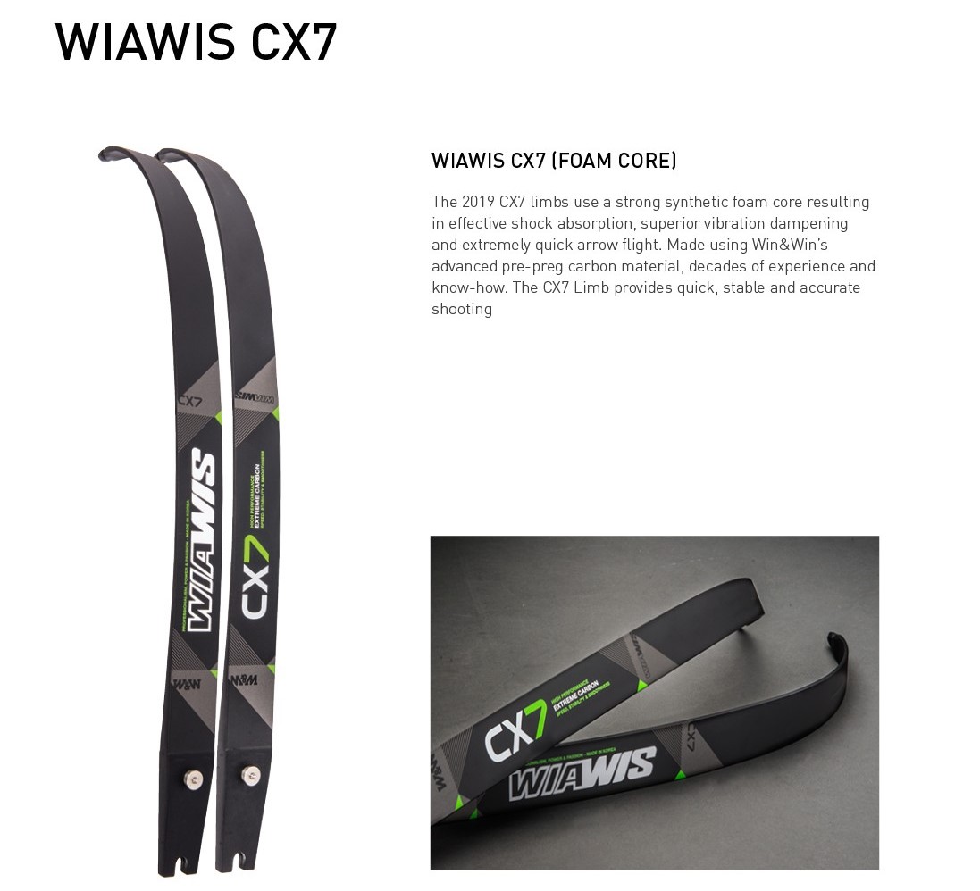 特點:2019 cx7弓片采用強大的合成泡沫芯,有效的減震,卓越的減震和極快的減速, 采用WIN&WIN先進的預浸碳材料,數十年的經驗和專業知識。cx7提供快速,穩 定,準確的射擊。